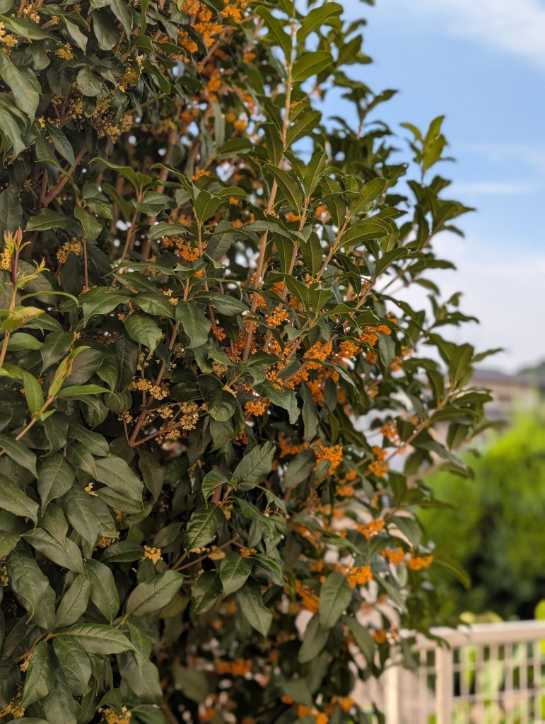 庭には植えないほうが良いともいわれますが、私は金木犀の花が放つ芳香が好きなので植えてます。