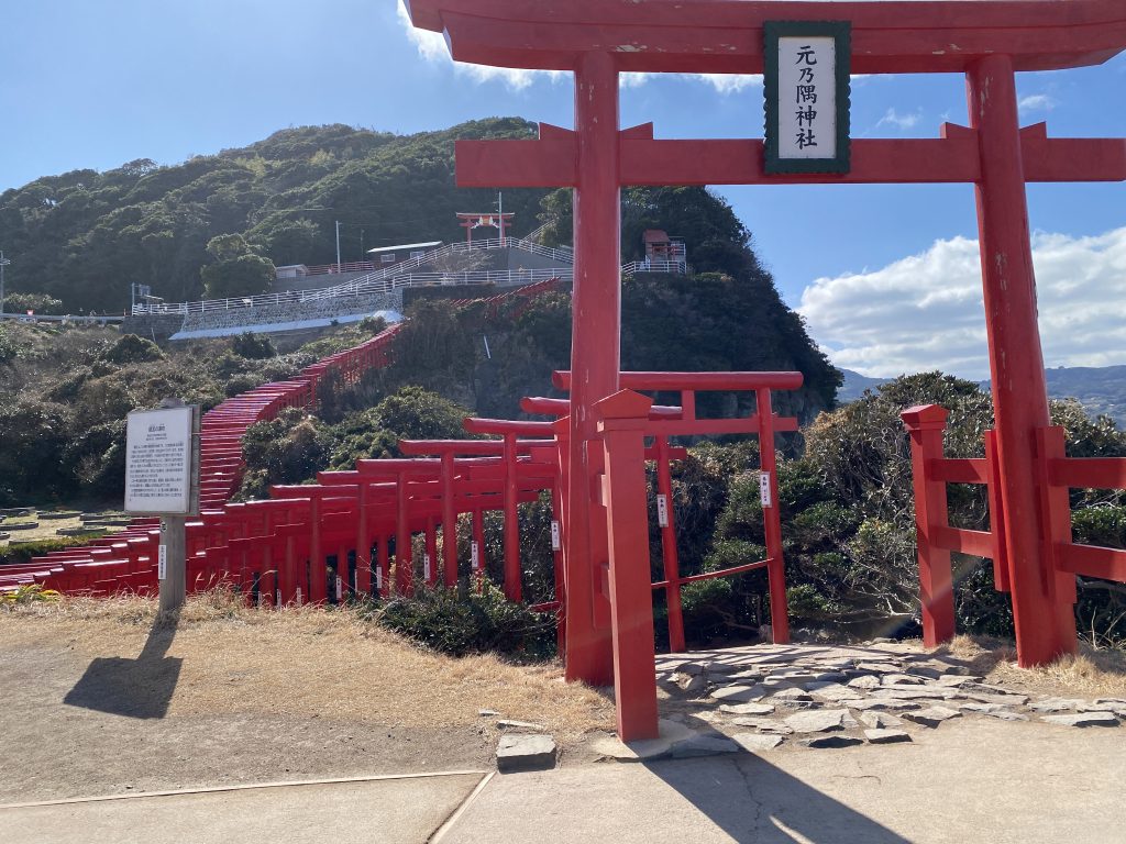 龍宮の潮吹きと言われる岬先端から100m以上にわたって123碁の赤い鳥居が並んでいます。