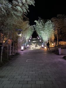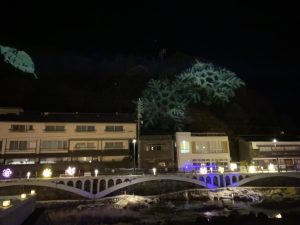 温泉宿から遊歩道を歩きながら見える川沿いのイルミネーションや