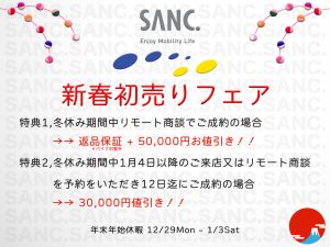 冬休み期間中(12/29-1/3)に初売りフェアへのご来場またはリモート商談をご予約頂き、フェア期間中に御成約を頂ければ3万円分の購入サポートをいたします。
